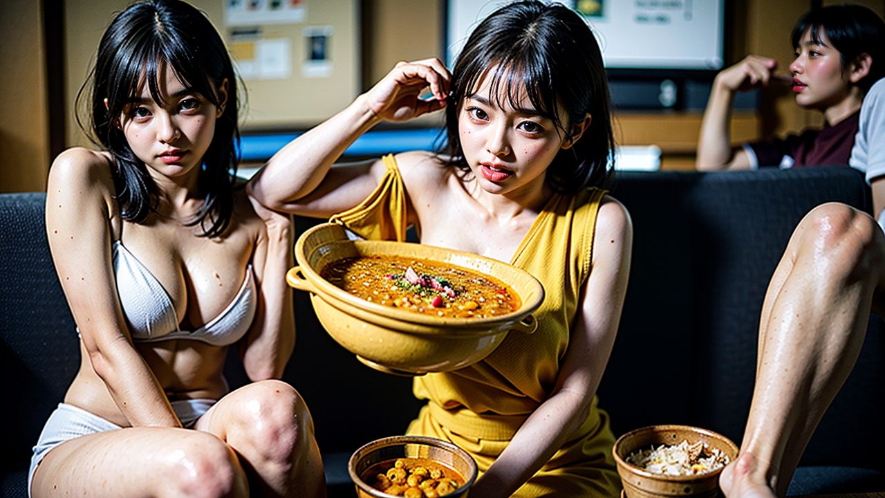 フラッシュモブ画像。激辛すぎて、汗だくになるので、全裸で、キーマカレーを食べる女性がいる、との情報が…。